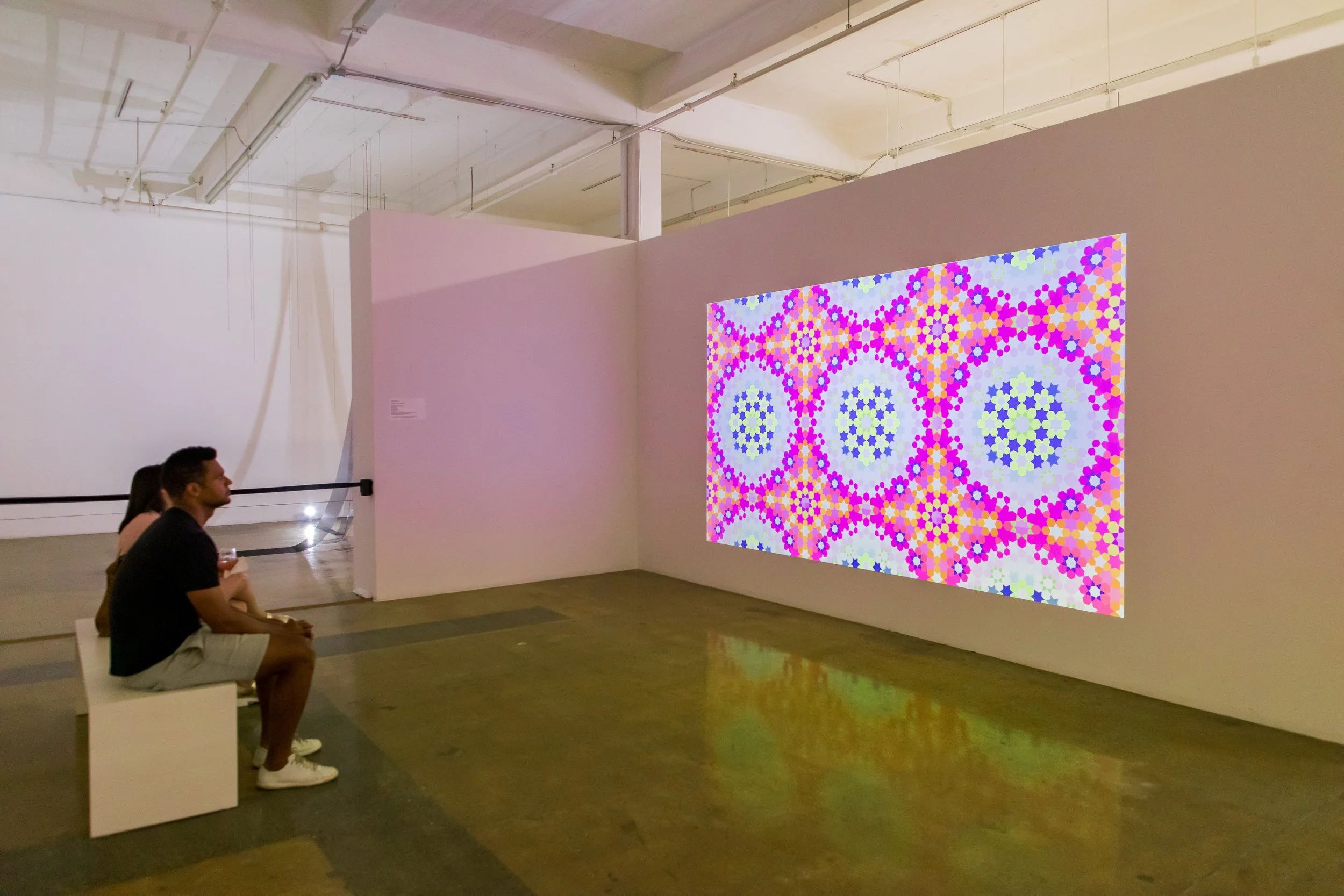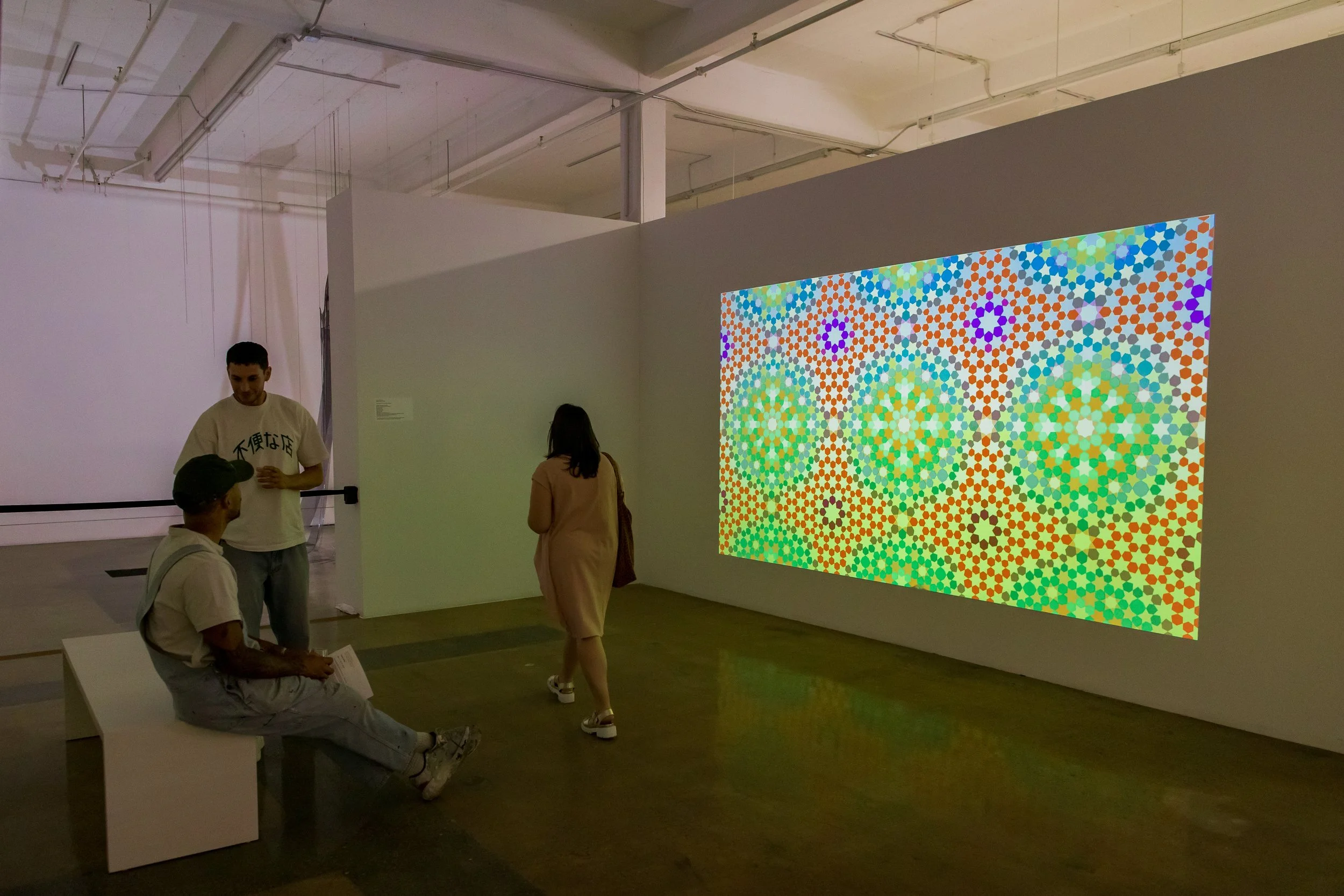 Sharjah Spectrum animation was installed at the Sharjah Art Museum in December 2015. The piece has had music composed especially for it and participants could choose the colours in the gallery with their mobile phones. The colour choices were updated via WIFI every 20 seconds. When there are no choices being made, the computer code made a random colour choice. The animation loops infinitely, the way it has been designed, it is very unlikely that the same colour and time sequence will ever repeat